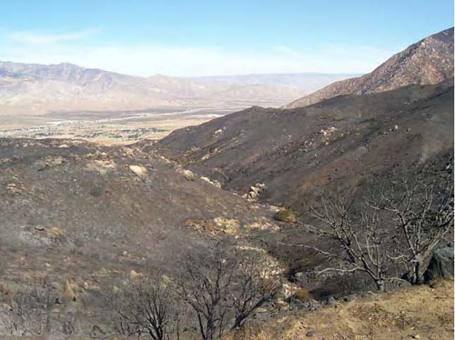 When the Santa Ana Winds began shortly before 12:00 a.m. PDT on October 26, they brought very dry air with relative humidity at or below 10 percent through Banning Pass. The winds through Banning Pass along the valley floor remained out of the east through all of October 26. Once the Santa Ana Winds began, they increased in strength through the morning hours of October 26. While winds in Banning Pass were out of the east, winds over the terrain to the south, including the accident site, were primarily out of the northeast. These northeast winds were in alignment with the slope (blowing directly uphill) in some areas, and were blowing across the slope in other areas. Where the wind and slope were in alignment, fire behavior became extreme. This was observed by several firefighters who were located at different sections of the Esperanza Fire. The inversion played a critical role in holding the strong northeast winds near the ground. In the absence of the inversion, the northeast winds would have expanded upward with a net reduction in wind speed near the ground. With the inversion in place, the air movement was confined between the ground and the inversion. As the air moves southwest from the Banning Pass area across the steadily rising terrain, the space between the ground and the inversion decreases. The inversion also rises as the air moves over the higher terrain but at an amount less than the ground is rising. The result is there is less space for the air to move through, as the air moves southwest over the higher terrain. In this situation, the wind speed increases as the air rises over the terrain. Highest wind speeds occur along ridgelines that are perpendicular to the wind direction. The final factor that proved critical in how fast the fire front moved through the accident site was the inversion being penetrated by the smoke plume rising approximately 2 miles southwest of the accident site shortly before the burnover. As discussed in the weather section, this plume rose to between 18,000 feet and 24,000 feet at a location directly downwind of the accident site. When this plume penetrated the inversion, it acted as a relief valve on the resistance of the wind trying to blow between the inversion and the terrain. With the plume in place, air could rise upward into the plume as well as move downstream under the inversion. This allowed wind speeds to increase rapidly just as the fire front was moving up the “unnamed creek drainage” toward the accident site. The plume acted as a chimney draft pulling the air upward. The only place this air could come from was through the “unnamed creek drainage” past the accident site. Topography The topographic features throughout the area can be described as steep, very broken terrain with many branching drainages and narrow canyons. The accident site has a north to northeast aspect and the “unnamed creek drainage” below the accident site is aligned northeast to southwest. The “unnamed creek drainage” is 1.5 miles long and is approximately ¼ mile wide with average slope at 25 percent. The run of the slope is at average of 50 percent. These features will cause winds to channel, compress, increase in speed, and become erratic. The United States Geological Survey Map, USDA Forest Service, Cabazon Quadrangle California-Riverside County, 7.5- Minute Series and site visit was used to describe the topographic features of the accident site. FIRE BEHAVIORThe fire consumed an estimated 500 acres within the first 2 hours as it ran to the southwest up Cabazon Peak. Numerous spot fires, including one greater than ½ mile ahead of the fire front were reported by firefighters on scene. During the first five hours of the fire, flame lengths were 30 to 60 feet with head fire alignment and the rate of spread (ROS) was approximately 60 chains an hour (ch/hr). The fire’s westerly travel direction and rate of spread was influenced by the following variables: