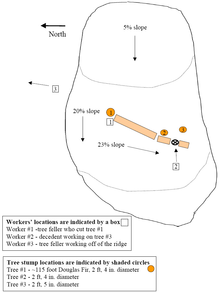 INTRODUCTIONOn April 13, 1998, the Washington FACE Program was notified by CFOI* (Census of Fatal Injuries) of the death of a 45 year old logger on April 10th . The Washington FACE Principal Investigator and the Field Investigator met with the regional WISHA** (Washington Industrial Safety & Health Administration) representative who was investigating the case. After reviewing the case with WISHA, the WA FACE team traveled with the WISHA representative to the incident site. The WISHA representative helped pinpoint the incident location, logging site detail, and defined the position of the loggers involved in this incident. The logging site was on private forest land owned by a forest products company. The company contracts with local logging firms to harvest their forest lands on a regular basis. Trees are harvested according to a schedule defined in a forest management plan developed by the landowner. The practice of contracting logging operations has become more common in the U.S., as the large forest products companies are streamlining and down sizing due to the economies of the business.1 This incident involved a contract with a local logging contractor who had been in the logging business for many years and had performed logging for this landowner and other land owners throughout the region. The victim in this fatality was a 45 year old male "logger". The deceased, at the time of the incident, was working as a tree faller in conjunction with two other tree fallers. The victim's co-workers will be noted in the body of this report, as "tree faller #1" and "tree faller #3". The victim will be noted as "tree faller #2". The team had been contracted to log (cut) a stand of trees located on private forest land. The team had been working this logging site for 30 days prior to the fatality. It is unclear whether the deceased was an employee working for the logging contractor or whether he was a self-employed / independent contractor. It is clear however, that the logging contractor directly employed tree fallers #1 and #3. The deceased had been in the logging profession for over 22 years and had considerable experience performing the varied types of jobs within the logging industry. Tree faller #3 (the victim's brother) also had over 20 years of experience, while tree faller #1 had the least amount of experience with only about 1.5 years in the logging business. Tree faller #1 was also a newcomer to the state.