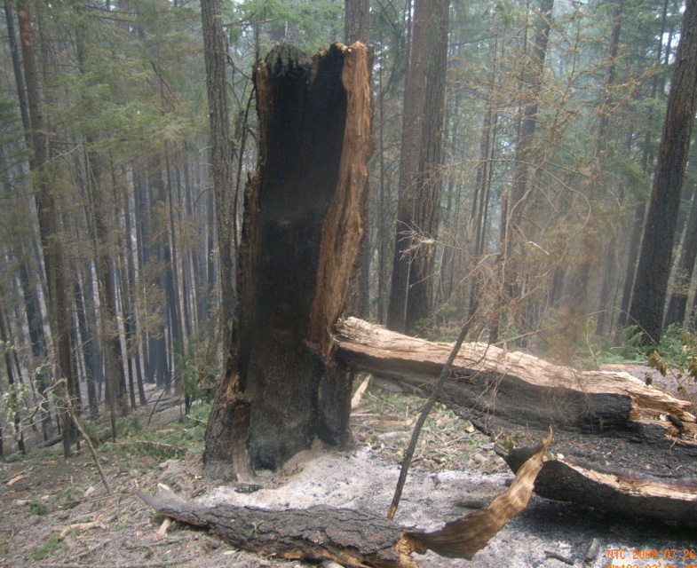 As Tree 1 fell, it is possible that it contacted Tree 3, breaking it off approximately 85’ from the ground. (Statement: CRWB1 [E-10]; MOI: FAL1[F-20] ) As Tree 1 continued to fall, it is possible that it contacted the bole or a limb of Tree 2. It was this contact, or the vibration from Tree 1 hitting the ground, that caused an approximately 120’ section of the severely weakened Tree 2 to break off 16’ from the ground and fall upslope.