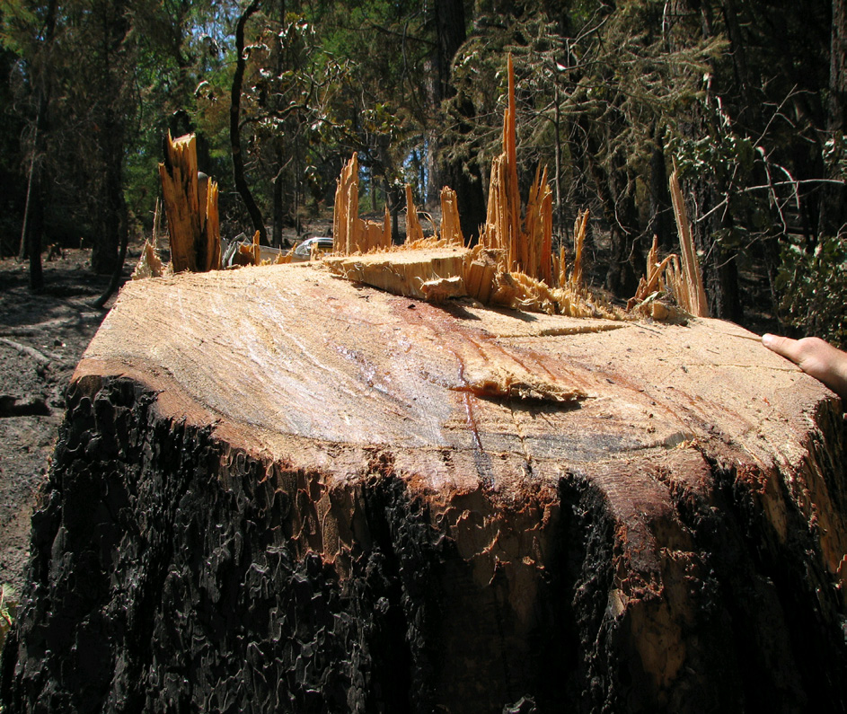 Starting at DP 17, EM-CAPT proceeded east along the dozer line cutting an undetermined number of hazard trees. When the crew members reached the accident site one of them proceeded to fall Tree 1. Tree 1 was 36.7” at the point of cut. The ponderosa pine, when examined, appeared to be green with no readily apparent defects that would have required it to be felled as a hazard tree. The first step in a procedural approach to felling is to survey the tree to be felled and the felling area for any hazards. Tree 2 would have presented a considerable hazard to anyone upslope from its base. The chainsaws EM-CAPT had with them had bar lengths of 28” and 32”; the diameter of Tree 1 at the point the cut was made was 36.7”. Regardless of which saw was used, the sawyer would have had to cut from both sides of the stump in order to complete the undercut. During this process, the sawyer experienced difficulty in obtaining a single plane, or hinge, across the diameter of the stump. This hinge is critical to the process that directs the tree into the undercut and the intended lay. Closer inspection revealed that the sloping section of the undercut was not cleaned sufficiently as to provide a single plane across the diameter of the stump. The stump exhibits two distinct horizontal (gunning) cuts and two sloping cuts. Multiple Dutchmen that would have altered the holding wood were also present. Due to the multiple horizontal (gunning) cuts and the multi-faceted sloping cut, it is impossible to accurately determine the exact intended lay of Tree 1; however it appears that the intended lay was to be downslope and to the left (looking downslope) of Tree 2 and 3. The sawyer made the decision that the undercut was completed sufficiently to direct Tree 1 into the intended lay, and proceeded with the backcut. As the backcut was initiated, it appears that the tree may have started to fall before the feller was able to get a sufficient amount of the holding wood cut.