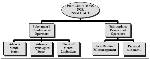 Clearly then, numerous substandard conditions of operators can, and do, lead to the commission of unsafe acts. Nevertheless, there are a number of things that we do to ourselves that set up these substandard conditions. Generally speaking, the substandard practices of operators can be summed up in two categories: crew resource mismanagement and personal readiness.